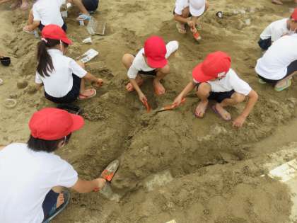 1年2組は、図工の学習で、砂や土の感触を味わいながら、土を集めて団子をつくったり、穴を掘って川を作ったりしながら、楽しく活動していました。
