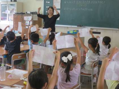 花を集めて教室に戻り、花と水を混ぜた色水をつくりました。つくった色水に、折った半紙をつけてみると、キレイな色に染まりました。
