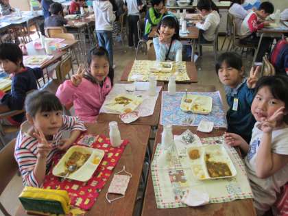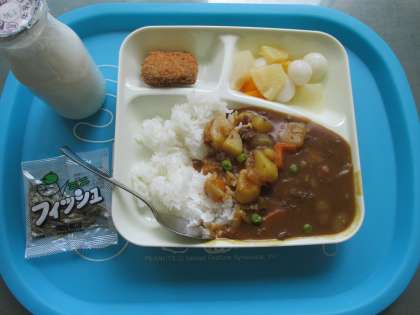 今日から給食が始まりました。メニューは「カツカレーライス・フルーツ白玉・ミニフィッシュ・牛乳」(入学お祝い献立)です。子どもたちは、1年生は初めての給食・他の学年は久しぶりの給食でしたが、みんな楽しそうに食べていました。【発信:教務 北風】