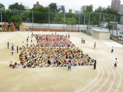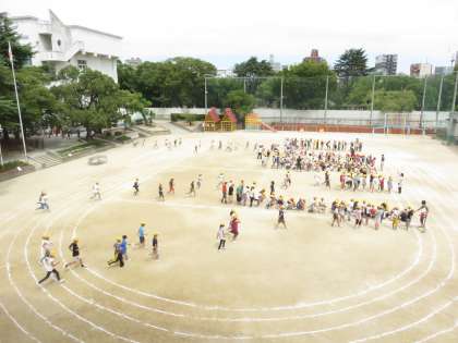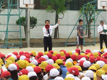 「3時間目の学習中、近畿地方を中心に強い地震が起こったため、運動場へ避難する」という設定で訓練を行いました。つづいて「津波も発生したため、運動場から校舎に避難する」という訓練も行いました。