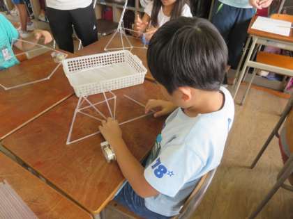 ストローを使った活動では、自由な発想でストローをどんどんつないでいきました。最初はちゅうちょするかと思っていましたが、どんどんイメージがわいてくるようで、子どもたちは楽しそうに活動していました。