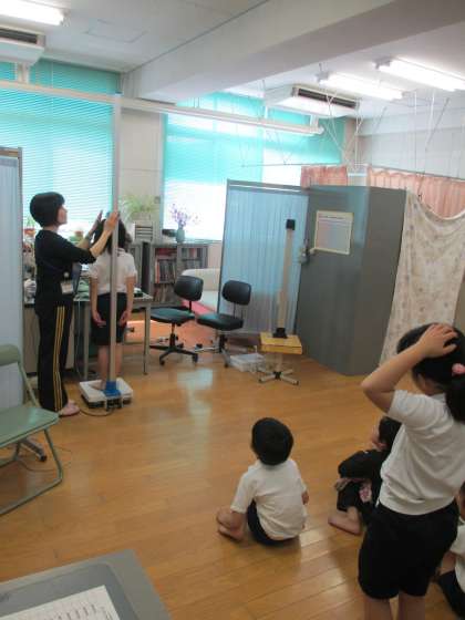 先週から各学年で発育測定が実施されています。今日は2年生が身長・体重・座高の3測定をおこないました。子ども達は「どれくらい背がのびたかな」と気になりながらも、静かに測定をうけていました。【発信:教務 北風】