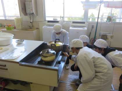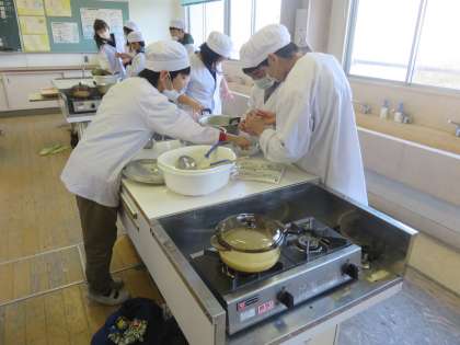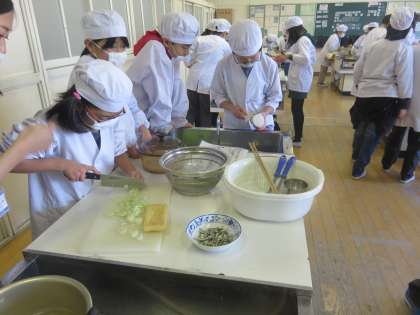 今日の実習では、「ごはん、みそ汁(大根・うすあげ・青ねぎ)」の調理を友だちと協力しながら班ごとに進めました。普段ガスコンロを扱う機会も少ないためか、こわごわ点火している様子も見られました。煮干しでダシを取り、具材を刻んでみそ汁を作りました。調理器具の扱いや手際のよさ等は積み重ねも必要なので、ご家庭でもご一緒に調理の機会をもたれるのもよい経験になると思います。【発信・教務】