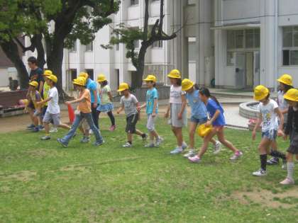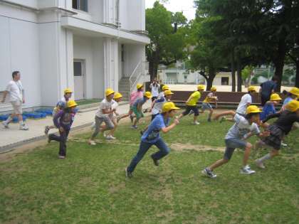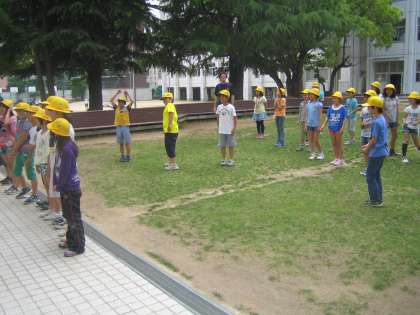 3時間目、5年1組は中庭で英語の学習をしていました。“What time is it Mr wolf?”というゲームで、子ども達はオオカミと羊に分かれます。羊が“What time is it Mr wolf?”と聞き、オオカミが(例えば)“It's seven o'clock.”と言うと、羊は7歩オオカミに近づきます。羊が近くまで来てオオカミが“It's dinner time.”と言うと、羊をつかまえに走ります。そこで羊はタッチされたら食べられるというゲームです。子ども達はゲームに夢中になって、楽しみながら時間に関する英語を学習しました。【発信:教務 北風】