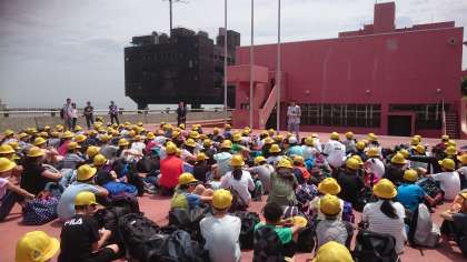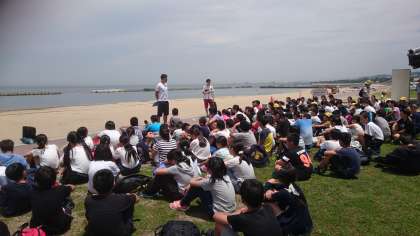 大阪府青少年海洋センターに到着して「ときめきビーチ」の海岸で、貝殻を拾ったり、砂遊びをしたりしました。