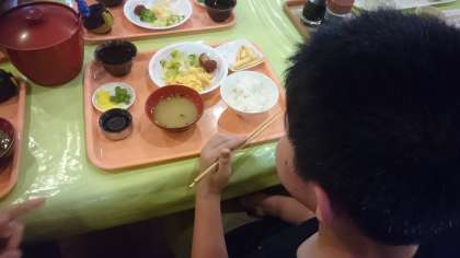 朝起きてから子どもたちは、体育館でラジオ体操をしたあと、朝食をしっかり食べました。