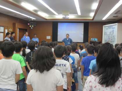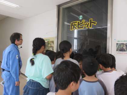 パッカー車がゴミを運んできてピットに投入する様子。集まったゴミをクレーンで運ぶ様子。焼却炉でゴミを燃やす様子など、ていねいに説明していただきました。また、ゴミを燃やす時に発生する熱を利用して、電気を発生させることも知ることができました。