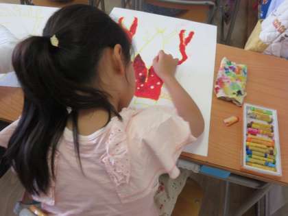 子どもたちは、“ざりがに”の頭・体・はさみ・足などの形や特徴をしっかりとらえ、黄色のクレパスを使って上手に描いていました。また、色の濃淡をよく見ながら、赤と黒のクレパスで色を重ね、上手に色の表現もしていました。