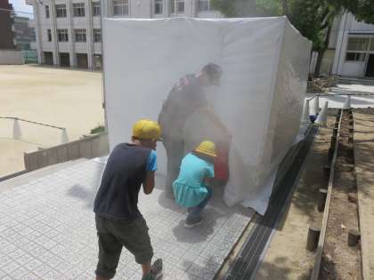 煙テントを使っての煙体験では、テントの中に人体に無害な煙を充満させることによって、火災時における煙の怖さと避難方法などについて体験学習しました。