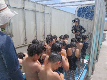 今日は快晴ですばらしい天気の中、1年生は初めて小学校のプールに入りました。ドキドキしている子もいたようですが、準備運動の後、シャワーをあびた子どもたちは、みんな大はしゃぎでした。プールに入ったら、顔に水につけたり、頭までもぐったりして、水慣れをしました。プールでの決まりやハンドサインの確認があったので、プールに入った時間は少し短かったように思いますが、良いプール日和で良かったと思います。