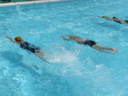 4年生は水慣れをしたあと、“けのび”“ふし浮き”“バタ足”の練習をしました。腕のまわし方や息つぎに大切なポイントを確認した後は、クロールもしました。