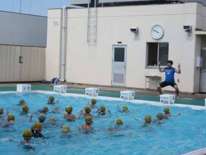 今日は『長い時間、水にもぐったり、浮いたりする』のがテーマだったので、子どもたちは、くらげ浮き・だるま浮き・ふし浮き・・・がんばっていました。上手に浮かんでいる子どもが多かったです。