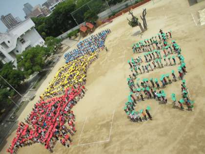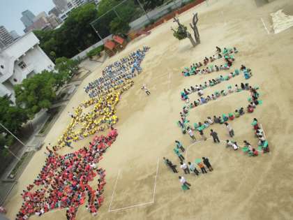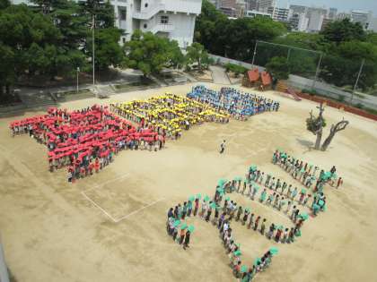 今日は、140周年の航空写真撮影がありました。子ども達は画用紙を持ち、「真田山2014」の文字を作りました。この写真は校舎から撮りましたが、本番はヘリコプターから撮っているので、はっきりと文字が見えていると思います。【発信:教務 北風】