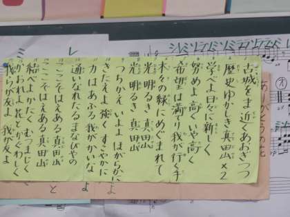 発声の練習をしっかりした後、運動会で歌う『君が代』『校歌』の練習をしました。特に『校歌」の練習は、一生懸命でした。キレイな声で歌の練習をしてから、みんなで心を合わせて歌っていました。運動会本番でも、すばらしい歌声を披露してくれることを楽しみにしています。