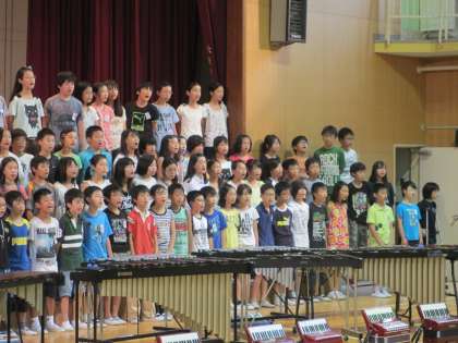 今日は、6年生の学年だよりがありました。「Let it go」(アナと雪の女王)「ふるさと」(嵐)を合唱し、「ヒカレ」(ゆず)を合奏しました。6年生は心を一つにして力を出しきりました。「チーム真田山」のリーダーの見事な演技を1〜5年生の子ども達は身をのり出して見入っていました。雨の中、見に来てくださった保護者のみなさん、学園の先生方ありがとうございました。【発信:教務 北風】