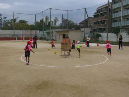 音楽に合わせて準備運動を行った後、的をめがけてボールを投げたり、フープの中にボールを投げ込んだり、友だちが投げたボールをキャッチしたり、チームに分かれて練習をしました。