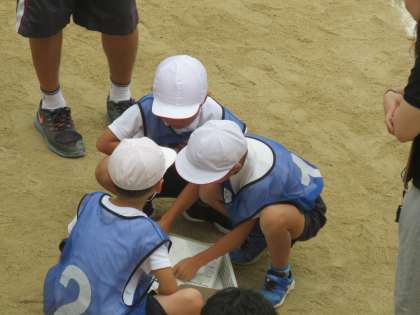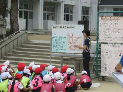 ルールやマナーを確認した後、みんなが楽しみにしていた“的あてゲーム”をしました。チームで作戦を立ててゲームに生かしたり、友だちを励ます声かけをしたりしている姿は、すばらしかったです。