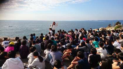 千畳敷では、学級ごとに記念撮影をした後、地層を観察しながら歩きました。自然のダイナミックさに、子どもたちは驚いていました。