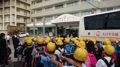 ホテル三楽荘に到着したら、子どもたちからは大歓声があがりました。今日泊まる宿舎を見て、うれしくなったようです。