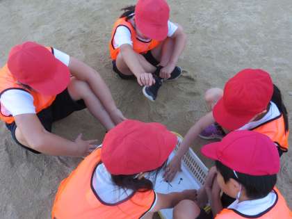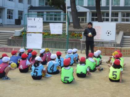 練習のあと、作戦タイムをとってからゲームをしました。立てた作戦を積極的に試しているチーム、友だちを励ましながらがんばっているチーム、的に当てるコツをアドバイスしあいながらボールを蹴っているチーム・・・など様々でしたが、みんな楽しそうに活動していました。得点できたときは、笑顔いっぱい喜んでいました。