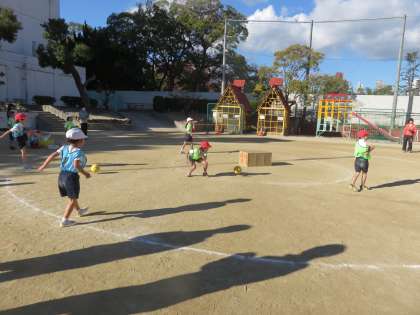 音楽に合わせて準備運動をしたあと、的当てゲーム・パスゲーム・ボール当てゲームを2チームずつローテーションしながらチームで練習をしました。お互いに声かけをしながら、がんばっていました。