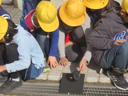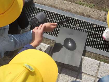 子どもたちは、虫めがねで日光を集めて、黒い画用紙に当てていました。光をあてながら明るい部分の大きさを変えていきました。