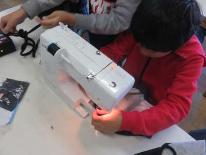 5年生は家庭科の学習でエプロンづくりをしていました。1学期に裁縫セットを使っての学習をしていますが、2学期のエプロンづくりでは、ミシンを使っていました。糸のかけ方やミシン操作の仕方をしっかりと覚えている子が多かったです。ミシンを動かすと勢いよく進むので、まっすぐに縫うため、子どもたちは慎重にミシンを扱っていました。慣れてくると、少しずつ速くして作業をしていました。