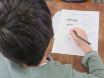 最初に、魚の名前を使ってビンゴをしました。さけ・さんま・かつお・いわし・さば・・・など、食卓で並ぶ魚の名前を子どもたちは良く知っていました。