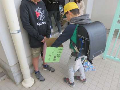 代表委員会の児童はこの取り組みの準備として、募金箱やポスターを作ったり、今日の朝会で全校児童への募金を呼びかけたりしました。そして、今日の登校時から通用門で募金を集めています。