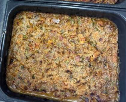 「カレーマカロニグラタン」は、鶏肉・米粉のマカロニ・たまねぎ・マッシュルーム、彩りにグリンピースを使用したカレー味のグラタンです。