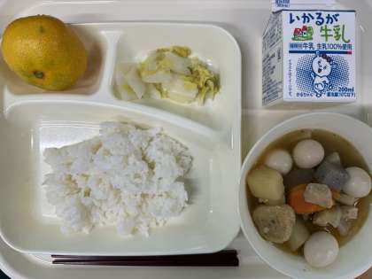 今日の給食では、鶏肉・うずら卵・ごぼう平天・じゃがいも・こんにゃく・あつあげ・大根・にんじんが使われています。