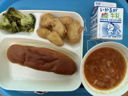 今日の給食の「白身魚フリッター」は、「たら」を使っています。衣には卵を使用していないため、卵アレルギーに子どもたちも食べることができます。