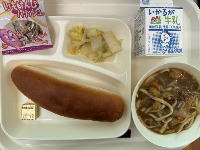 今日の「カレーうどん」は、けずりぶしどこんぶでとっただしに、牛肉・うどん・うすあげ・たまねぎ・にんじん・青ねぎが入っています。だしがしっかりときいていて、体が温まる献立でした。