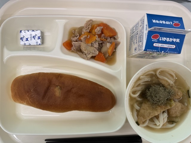 三角形に切って甘辛く煮たうすあげの他に、かまぼこ、・白菜・青ねぎが入ったうどんに教室でとろろこんぶを入れていただきました。