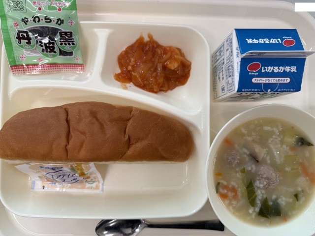 給食の「中華がゆ」には、米のほかに、肉団子、チンゲンサイ、大根、にんじん、しいたけが入っています。