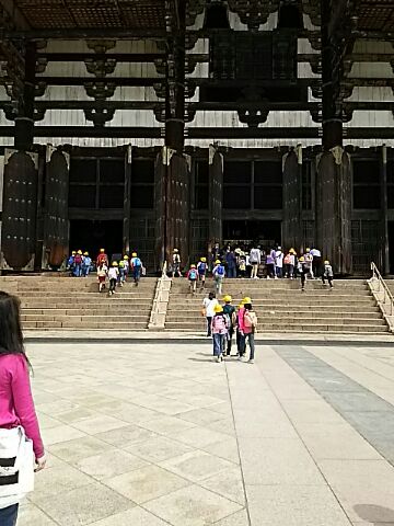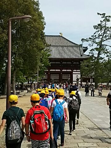 東大寺を見学した後、グループごとに地図を見ながら二月堂を経て若草山をめざしました。若草山でお弁当を食べたあと、頂上付近まで登っている子もいました。午後は春日大社を通り、芝生の広場で活動した後、五重塔を見学しました。