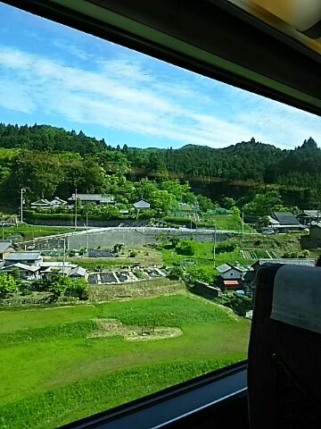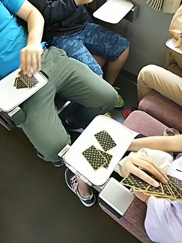 あおぞら号の車内ではカードゲームなどで楽しく過ごしています。車窓から見える豊かな自然の風景も楽しんでいるようです。現在、名張駅です。