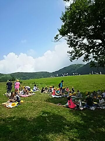 昼食のお弁当を食べています。高原はとてもさわやかです。