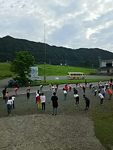 おはようございます。林間学習もいよいよ最終日がスタートです。朝の集いで体操をしています。