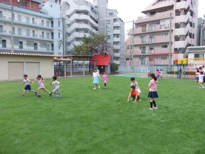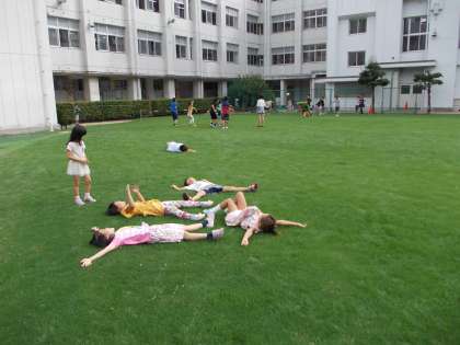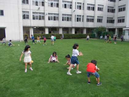ふかふかの芝生の上で寝っ転がったり、走り回ったりと、元気いっぱい久々の運動場での遊びを満喫していました。