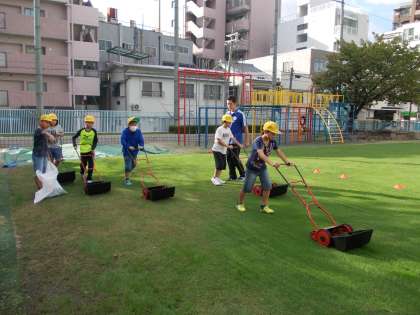 芝刈り機を前に押すだけで、どんどん伸びた芝を刈ることができて、初めて芝刈り機を使う児童はとても気持ちよかったみたいでした。