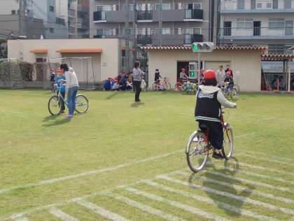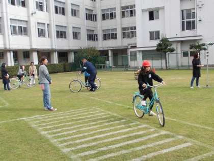 3時間目は運動場で実技指導でした。信号あり・なしの交差点や、自転車横断帯あり・なしの横断歩道の通り方など、初めて知った児童もいました。