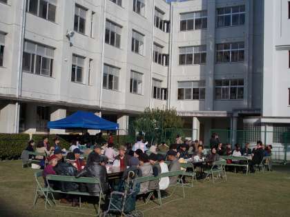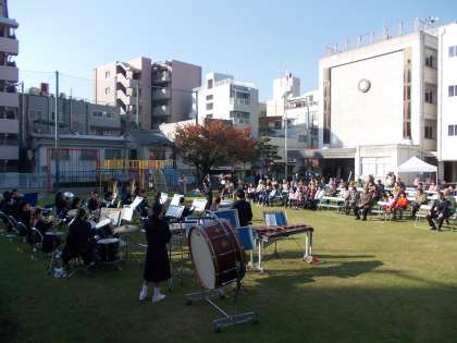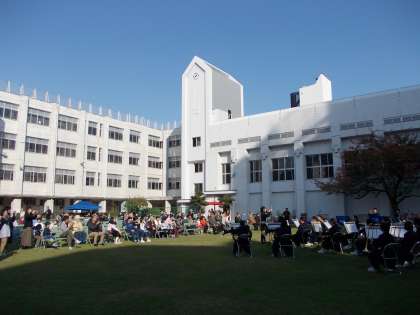 学芸会終了後、午後からは毎年恒例の芝生開放デーでした。今年度は、高津中学校の吹奏楽部の皆さんにお越しいただき「芝生の上で音楽会」を実施いたしました。暖かな秋晴れの下、素晴らしい演奏を披露していただき、ゆったりとした時間を過ごすことができました。