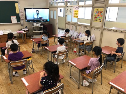 感染症対策や熱中症予防に向けた取組の1つとして、Microsoft Teamsを利用して職員室と各教室をオンラインで結び、児童朝会を実施しました。