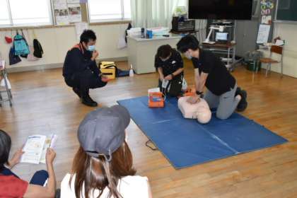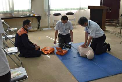 通常の救命処置であれば、意識や呼吸の確認→救急車・AEDの要請→胸骨圧迫30回→人工呼吸2回→胸骨圧迫30回→人工呼吸2回(救急車やAEDが来るまで繰り返す)という流れで行うのですが、感染症対策を考慮し人工呼吸を行わず胸骨圧迫を中心とした救命方法をみんなで確認しました。