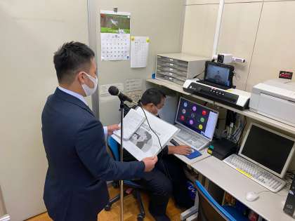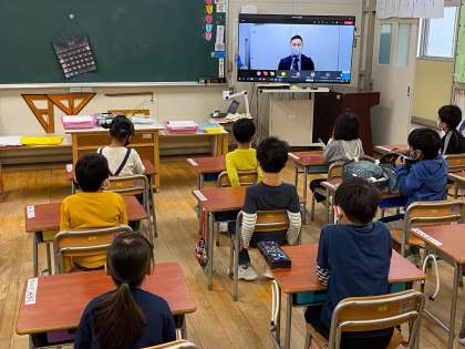 職員室で話している様子を各学級の大型テレビにオンラインで配信する仕組みです。