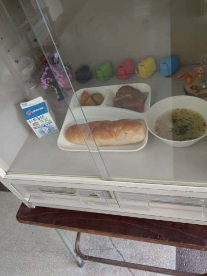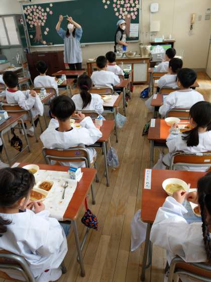 1年生は初めての給食、今日のメインは煮込みハンバーグです。会話を控えた給食でしたが、どの子もみんなおいしそうに、ほおばっていました。