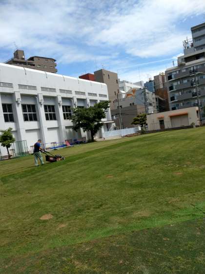 運動場では、管理作業員さんを中心に、芝刈りを行っています。