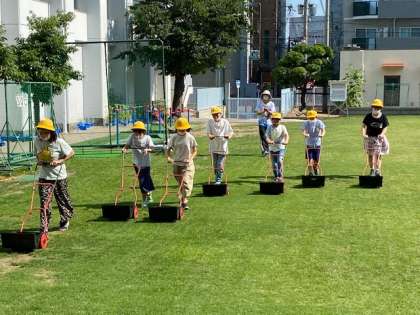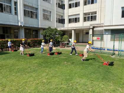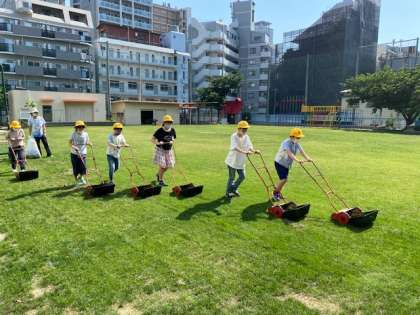 はじめはうまく芝刈り機を押すことができませんでしたが、慣れてくるとすいすいと上手に芝を刈ることができました。