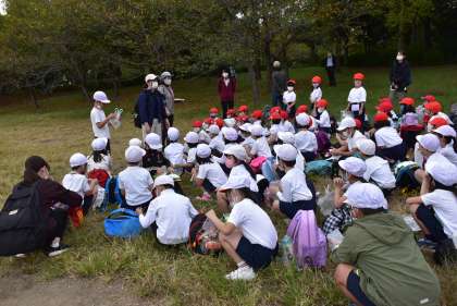 鶴見緑地公園につくと、広場まで歩いてから秋探しです。「きれいな色の葉っぱを見つけたよ」「ほっそりした形のどんぐりだね」楽しそうな声があふれます。